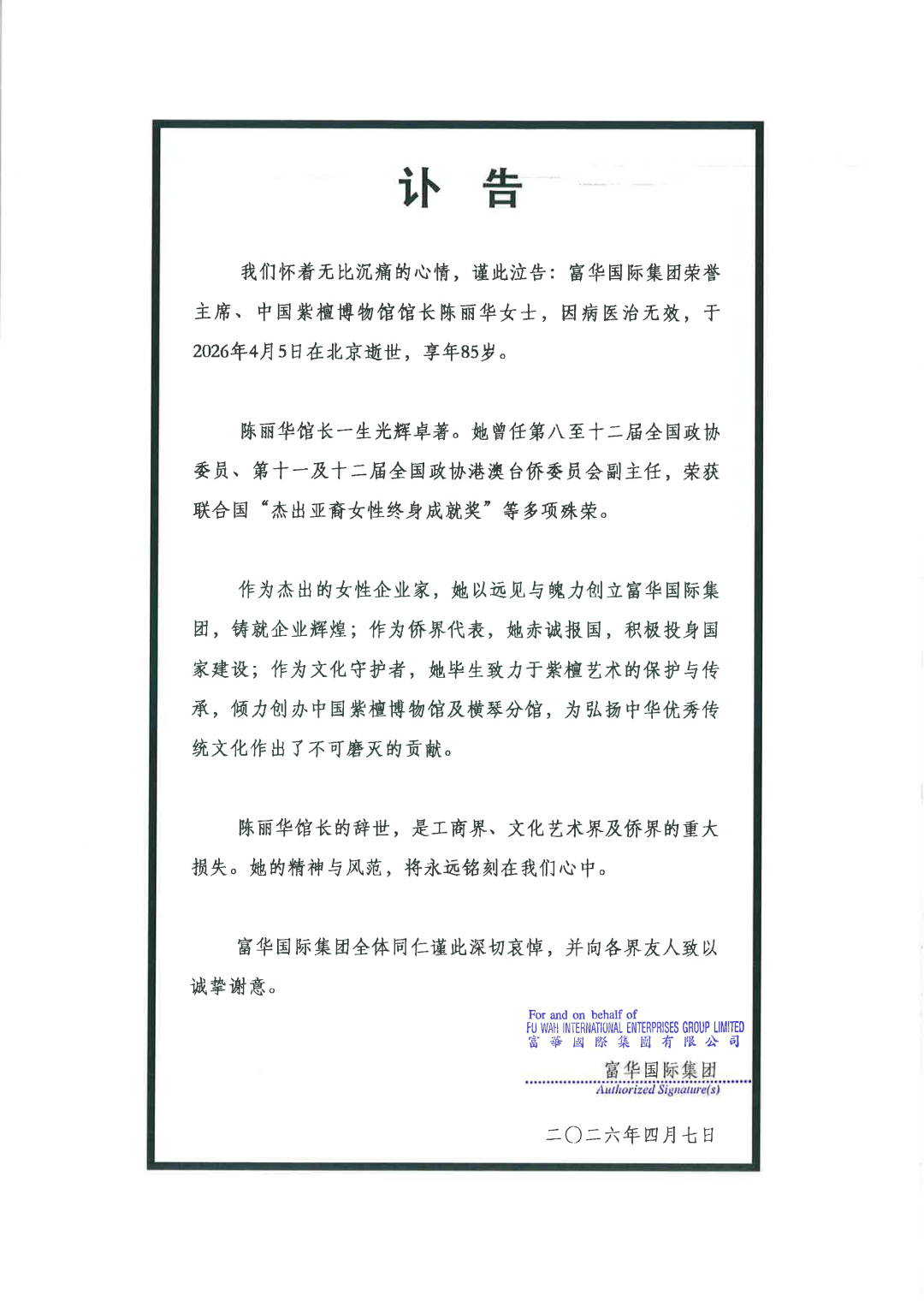 +订阅4月7日,富华国际集团发布讣告:富华国际集团荣誉主席、中国紫檀博物馆馆长陈丽华女士,因病医治无效,于2026年4月5日在北京逝世,享年85岁。