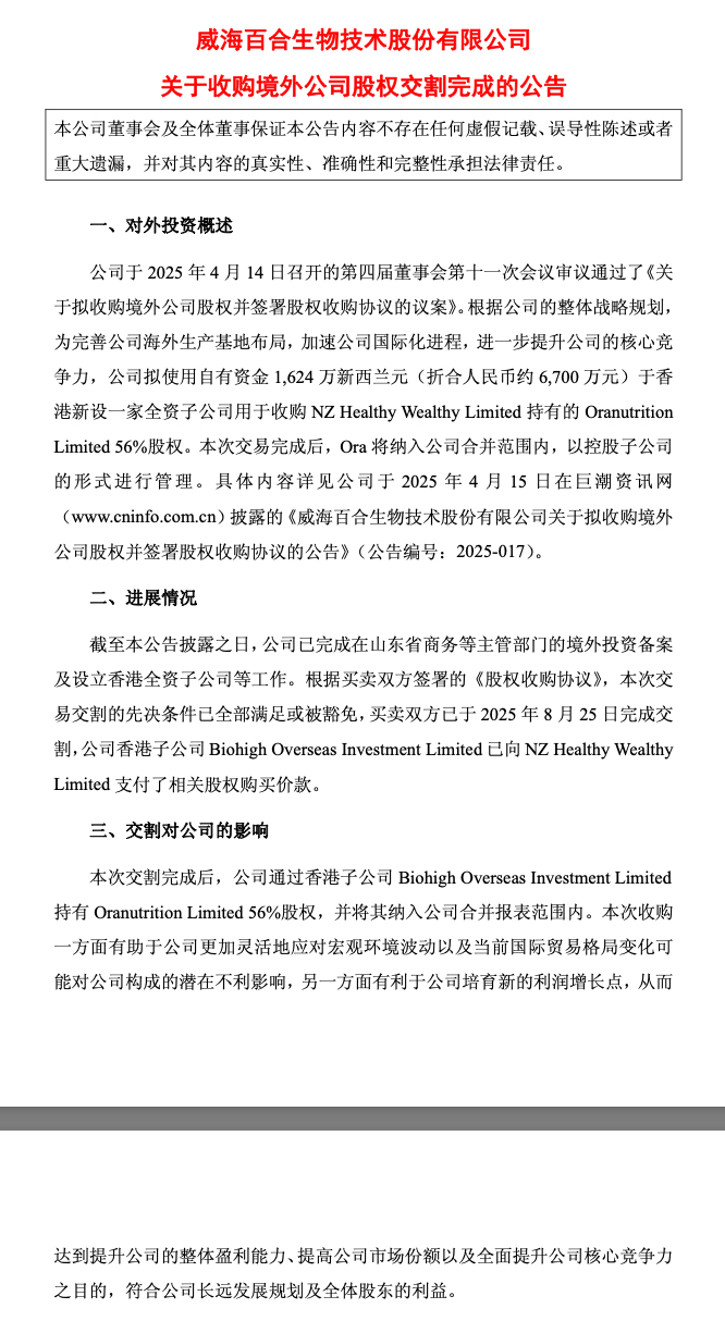 面对外界质疑,部分品牌会公布全球代工厂名单,但这些代工厂的资本背景同样值得探究。以优思益公布的核心生产基地新西兰Oranutrition与澳洲Ferngrove为例,百合股份此前的公告显示,其已出资约6700万元收购Oranutrition Limited的56%股权。另据大连医诺公开转让说明书披露,Ferngrove不仅由华人控制,还是中国原料企业的大客户,仅2024年一季度向大连医诺采购万寿菊提取物等原料的金额就超过800万元。