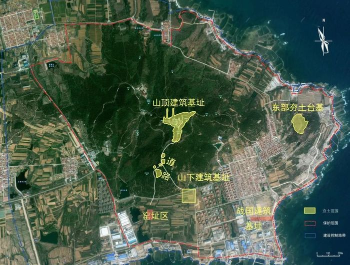 考古发掘确认了由山顶高台建筑和山下院落构成的“秦修汉葺”的高等级建筑群,可谓临海而建的国家工程,考古发掘填补了秦汉时期关中以外高台建筑考古的空白。山顶建筑基址平面呈“T”字形,总面积约45000平方米,分为多个层级。最上层推测为高台建筑核心殿堂基址,东、西两侧不同层级台面上发现房间、廊道、踏步、院落门址、石铺道路及排水、集蓄水设施等。