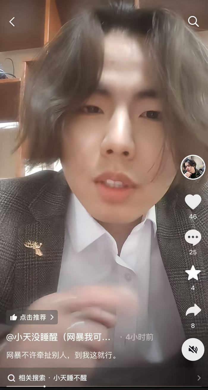 4月7日晚,名为“@小天没睡醒”的短视频账号发布了一段回应视频。视频中,涉事海河牛奶直播间的男主播针对其7日下午遭遇的网络暴力进行了公开回应。