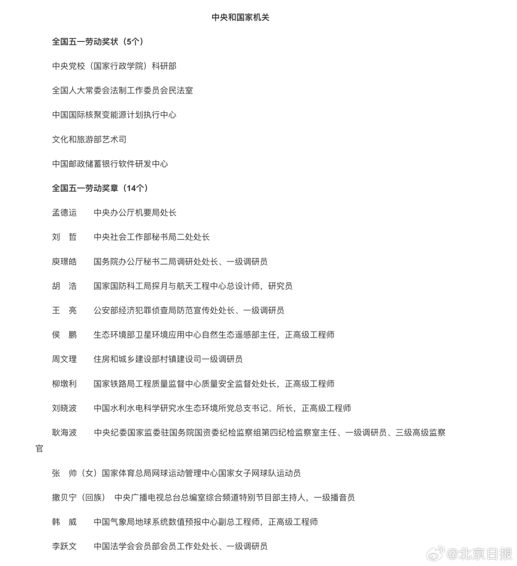 @北京日报 消息,今日(4月9日),全国总工会发布通知,对2026年全国五一劳动奖拟表彰对象予以公示。拟表彰荣誉包括全国五一劳动奖状、全国五一劳动奖章、全国工人先锋号三个类别。公示时间从2026年4月9日起,至4月13日止。记者梳理发现,中央广播电视总台总编室综合频道特别节目部主持人,一级播音员撒贝宁拟获表彰。