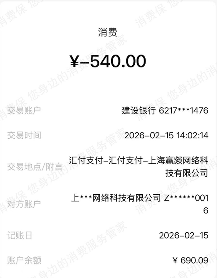 该消费者在投诉中提及上海赢燚网络科技有限公司(下称“赢燚网络”)与汇付支付两家公司。据了解,赢燚网络为一家权益服务商。该消费者上传的扣费截图显示,消费者在"果然花"平台中遇到的强制扣费行为,是由第三方权益服务商进行实际扣费,而汇付支付为该笔扣款提供了支付通道支持。
