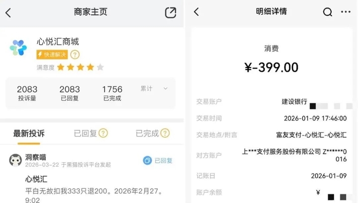 其中,心悦汇商城是投诉重灾区,在黑猫投诉平台的累计投诉量已达2083条,多名消费者均表示对平台的扣费行为毫不知情。消费保平台的投诉信息显示,该平台的扣费行为涉及富友支付、快钱支付等多家持牌支付机构。