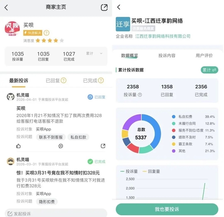 另一款名为“买呗”的商城平台的投诉量也居高不下,在两大投诉平台的累计投诉合计高达3393条,核心投诉问题均为私自扣费、隐形扣费,涉及深圳快付通、宝付支付等支付机构。