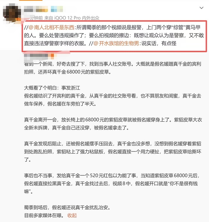 “事发浙江。假名媛结识了开宾利的真千金,从真千金的社交账号看,也不算朋友和闺蜜。真千金去做车保养,假名媛在车旁拍了半天。真千金离开一会,放长椅上的68000元的紫貂皮草就被假名媛穿身上了。紫貂皮草大衣全新未拆牌,真千金自己还没穿,被假名媛拿走了。真千金发现后阻止,还被假名媛摆手压回去,真千金也没多想,没想到假名媛穿着紫貂到处跑乱拍照,紫貂粘上了强力粘鼠板,假名媛直接一个用力硬扯,把紫貂皮草给撕坏了。事后也不当事,发给真千金一个520元红包以为能了事,当知道紫貂皮草68000元后,假名媛直接拉黑真千金。真千金找过去后,视频中,假名媛开口就是‘你不是很有钱嘛’。警察到场后,假名媛还说真千金扰乱治安。”