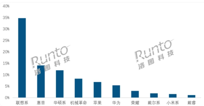 品牌格局方面,联想系以约35%的份额稳居第一,惠普约14%位列第二,华硕系约12%紧随其后,机械革命和苹果分别以约8%和7%的份额占据第四、第五位。