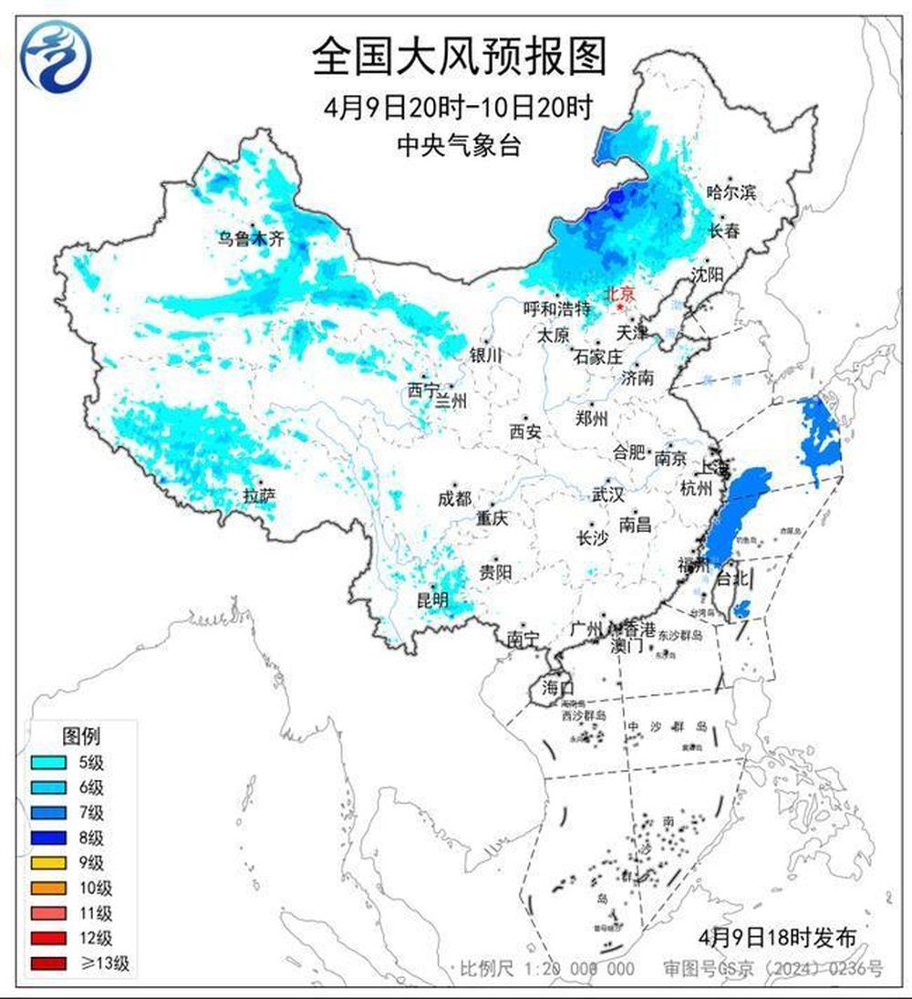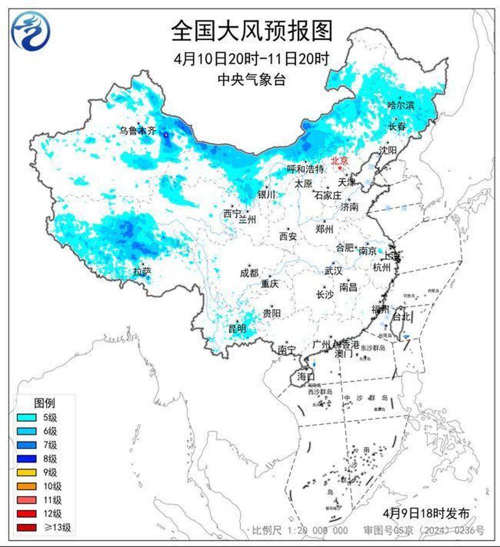 预计,4月9日20时至10日20时,新疆东部、甘肃中西部、青海北部、内蒙古中东部、吉林西部、辽宁西部、河北北部、山东东部、西藏中南部、四川西部、云南东部等地部分地区有5~7级风,阵风8~9级,内蒙古东部局地阵风10级以上;东海北部和西南部海域有7级风,阵风8级。