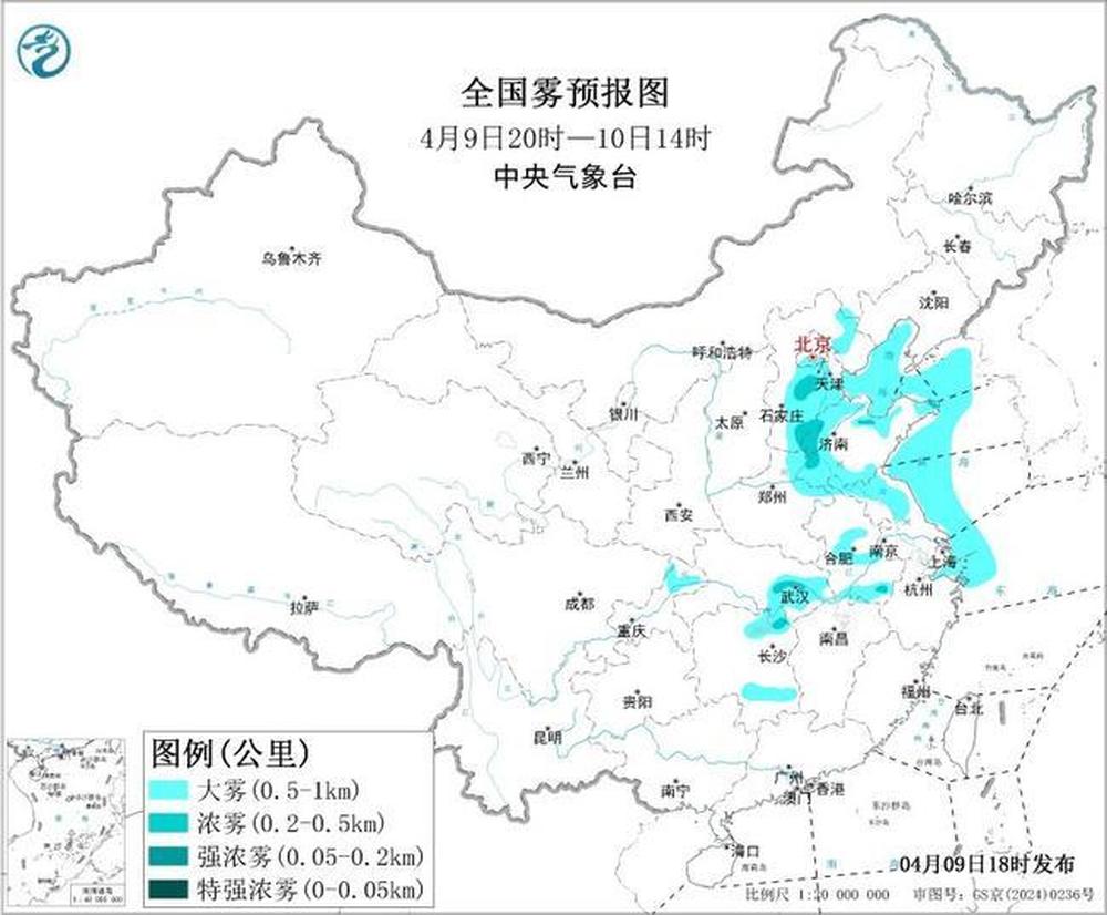 预计,4月9日夜间至10日上午,渤海、渤海海峡、黄海北部和西部海域、东海西北部海域、长江口附近海域将有能见度不足1公里的大雾。此外,河北中南部、北京南部、天津西部、河南东北部、山东西部和北部、江苏北部、安徽中南部、湖北东部、湖南东北部等地的部分地区有大雾天气局地有能见度不足500米的浓雾