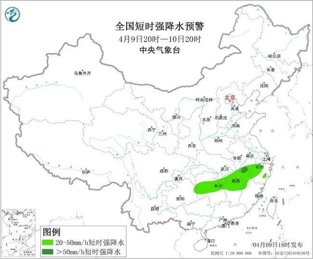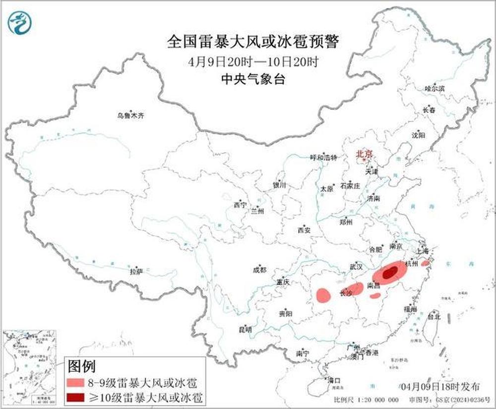 预计4月9日20时至10日20时,江南中北部等地的部分地区将有8级以上雷暴大风或冰雹天气,其中,安徽南部、江西东北部等地的部分地区将有10级以上雷暴大风,最大风力可达11级以上;安徽南部、湖南中部、江西中北部、浙江西部等地的部分地区将有小时雨量大于20毫米的短时强降水天气,其中,安徽南部、江西东北部等地的部分地区小时雨量大于50毫米。