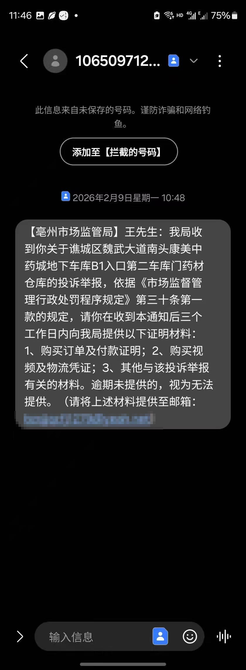 钟先生提供的一条市场监管部门2月9日发给王先生的短信截图显示(落款为“亳州市场监管局”),市场监管部门要求王先生提供对位于谯城区康美中药城一药材仓库的投诉举报的购买订单及付款证明等相关证据。