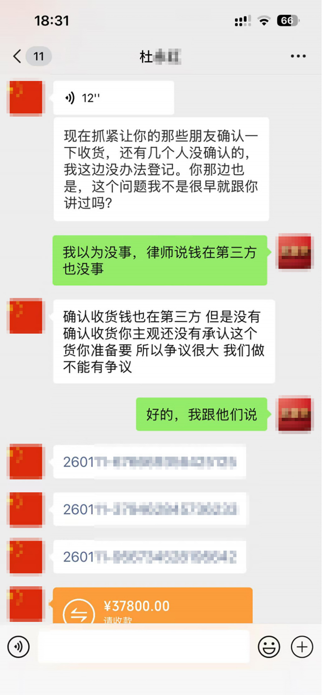 “老黑”还在群里发布了大量与“杜某某”的聊天记录。聊天记录显示,“杜某某”向“老黑”四次转账,合计111400元。“杜某某”要求群成员“确认收货”,称局里安排人在对接平台,针对钱款没有到商家账号的现状担心钱款不能构成非法所得,会问问司法部门。