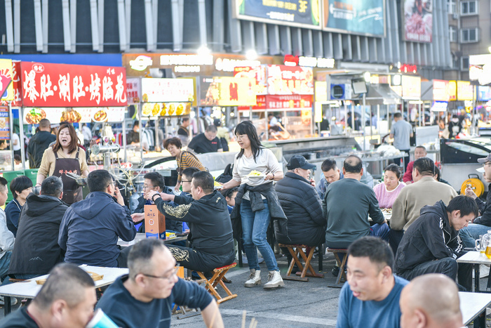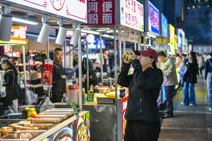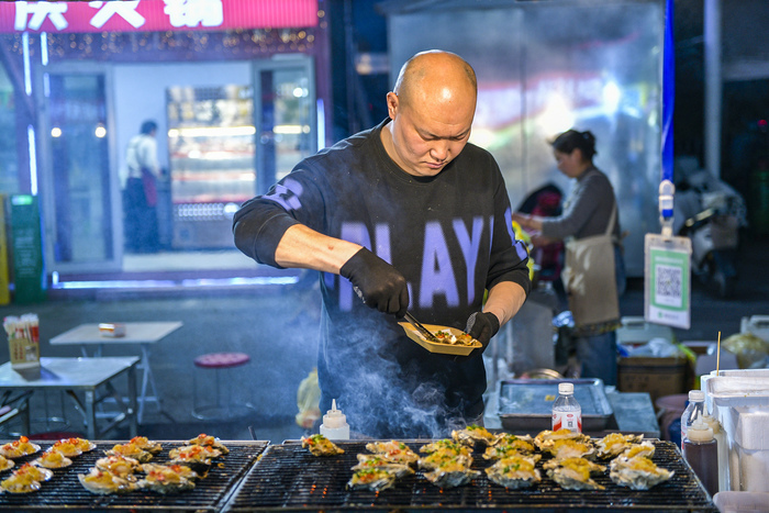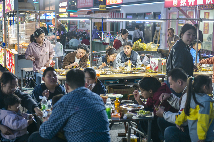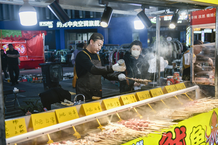 相较于年轻摊主的稳步起步,36岁的大排档摊主周鹤则在这里实现了创业进阶。他告诉记者,自己已经在月星夜市集摆摊4年,摊位从最初的9米长,逐步升级到18米,今年更是直接拿下了30余米的摊位,主营烧烤、炒菜和啤酒,“去年的营业额达到了180万,还实现了开酒厂梦。”周鹤坦言,规范化的夜市为手艺人提供了稳定的展示平台,也让小生意有了扎根生长的土壤,“这里不少商户都是夫妻档、父子档,灵活就业的模式,为一个个家庭增添了收入来源。”
