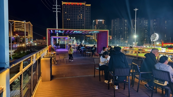 “站在二楼既能看到夜市的热闹人流,又能感受小清河吹来的阵阵微风。”市民李女士带着家人前来打卡,手里端着刚买的烤生蚝,脸上满是惬意,“这里的露台太舒服了,三五好友坐着聊聊天、品品美食,氛围感拉满。”