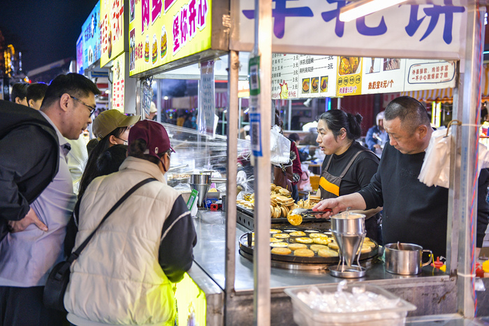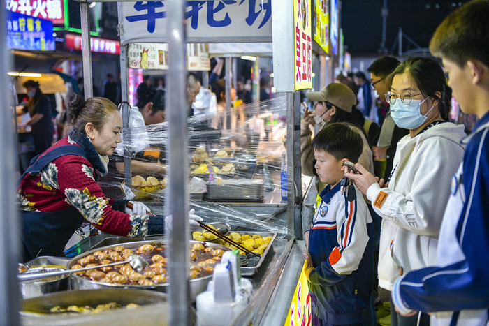 4月10日晚7点,市民张女士带着孩子专程前来排队购买“网红”舒芙蕾,她笑着对记者说:“这排的不是队,是咱济南人的烟火气!去年就来吃过,今年夜市升级后,继续带着孩子来逛逛。”
