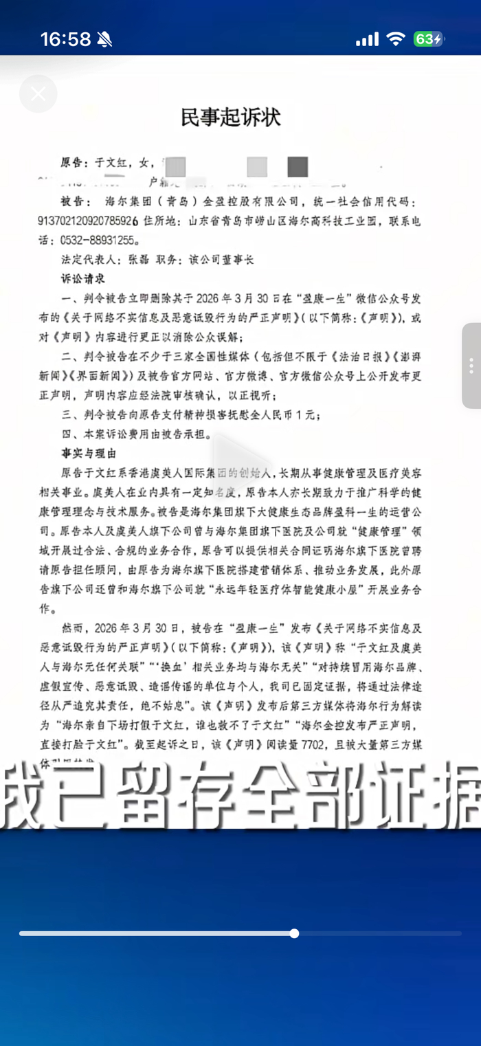 海尔金控的“切割声明”发布11天后,卷入“换血抗衰”风波的医美品牌创始人于文红提起了名誉权诉讼。