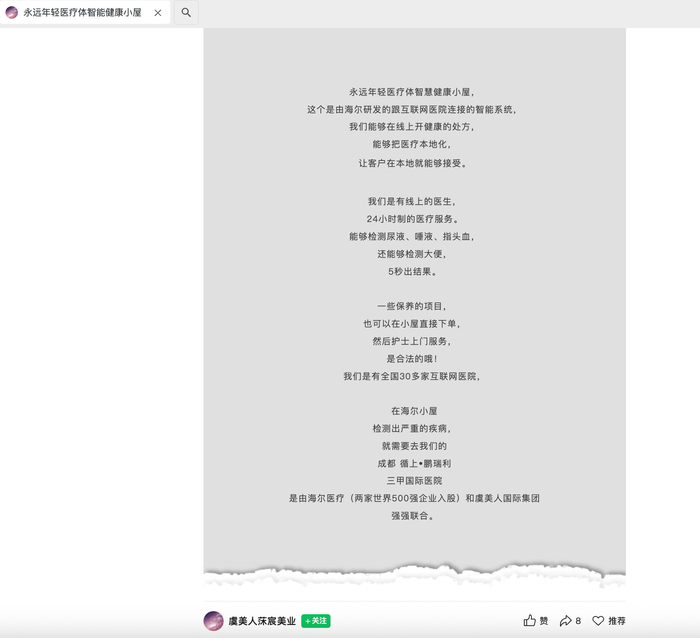 该宣传资料还明确标出了这套体系的业务导流方向:“在小屋检测出严重的疾病,就需要去我们的成都循上·鹏瑞利三甲国际医院,(该院)是由海尔医疗和虞美人国际集团强强联合。”据《中国新闻周刊》报道及鹏瑞利集团财报等公开资料,该院实为一家拥有350张床位的二级综合医院。