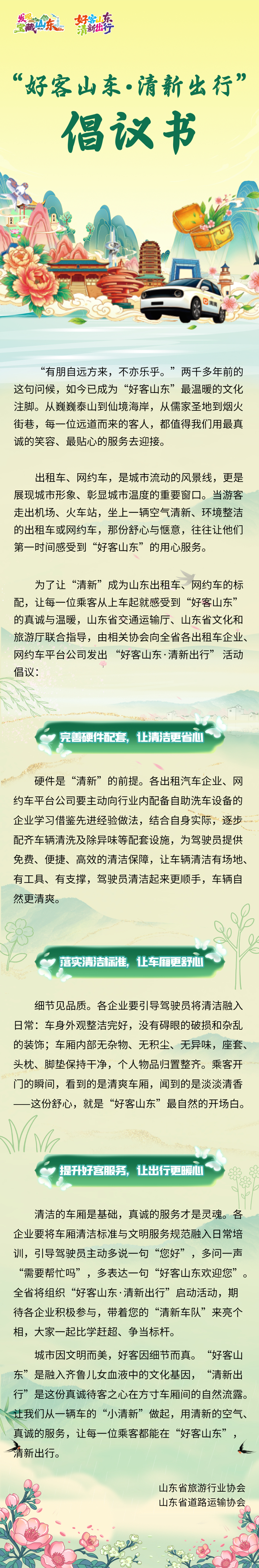 眼下,由山东省文化和旅游厅、山东省交通运输厅联合指导,省道路运输协会、省旅游行业协会共同发起,滴滴出行等平台响应的“好客山东·清新出行”行动,正在全省范围内稳步推进。今年年初,济南已率先在出租车行业启动“清新车厢”相关活动,通过行业引导和司机响应,取得了很好的反响。