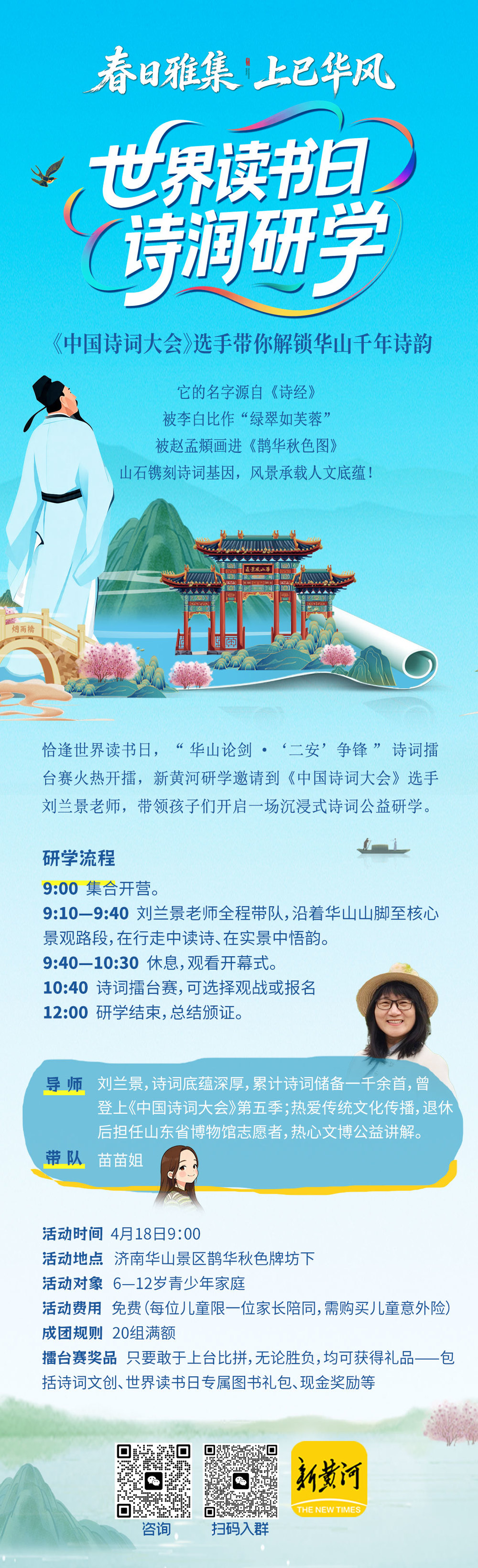 恰逢世界读书日,在“华山论剑·‘二安’争锋”诗词擂台赛火热启幕之际,一场沉浸式诗词公益研学同步来袭!新黄河研学特邀《中国诗词大会》选手刘兰景老师担任研学导师,带领孩子们走进华山(华不注),读懂山水里的诗词密码,解锁济南千年文脉,赴一场诗与山水的约会!