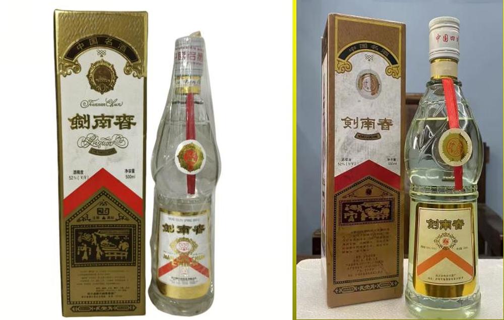 图为真假“剑南春”的对比,左为真品,右为查获的假冒产品。(四川省市场监管局供图)