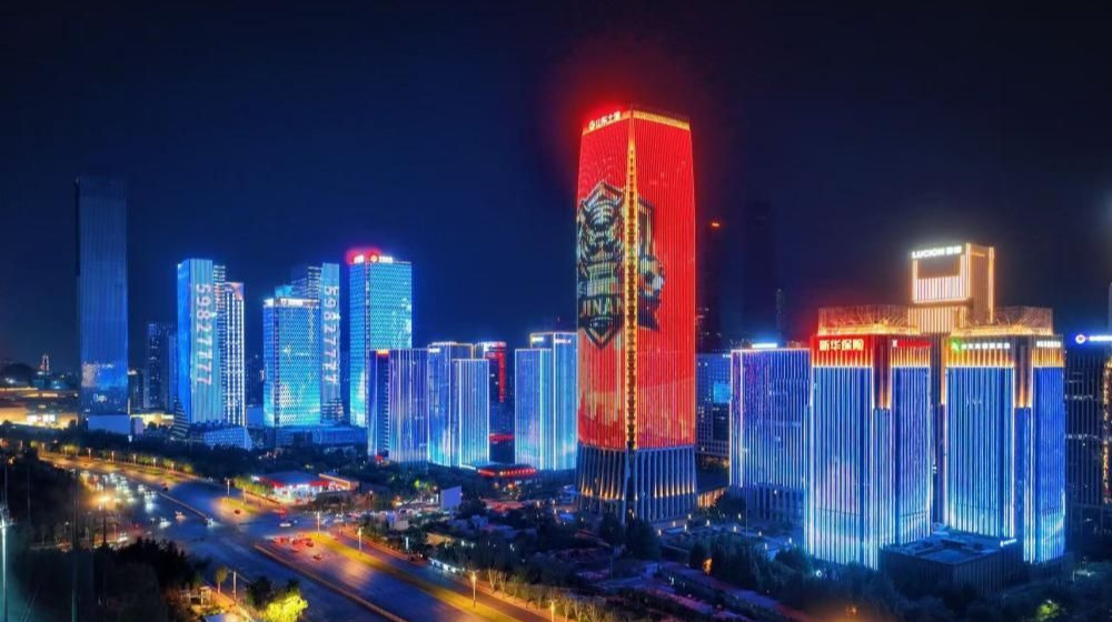 济南经十路灯光秀助威齐鲁超赛济南赛区首轮比赛