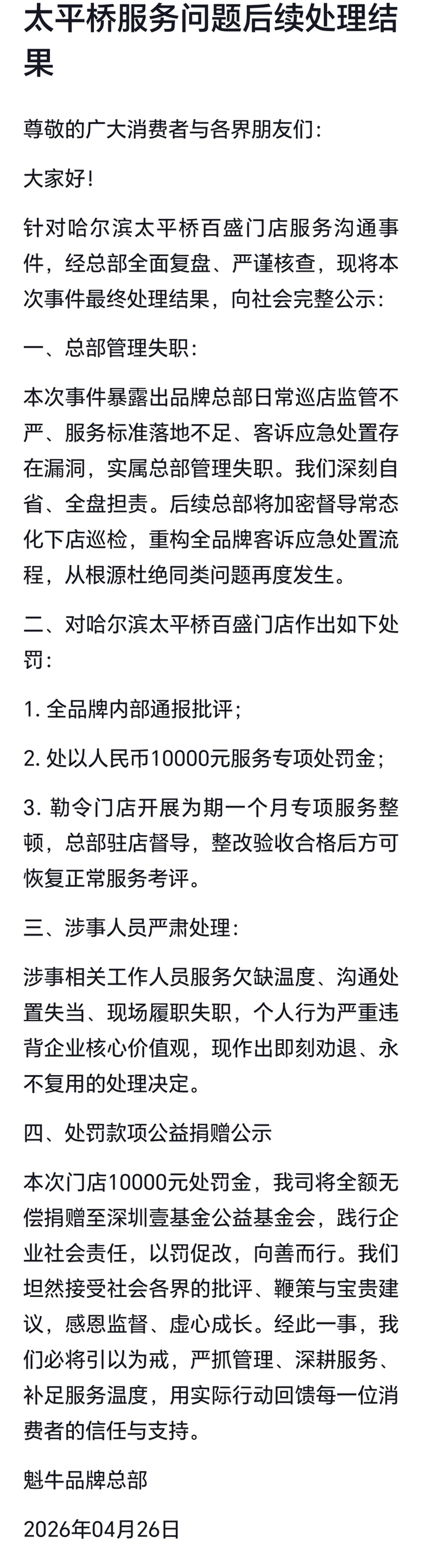 26日晚,品牌方公布对事件的处理结果,称:“一、总部管理失职:本次事件暴露出品牌总部日常巡店监管不严,服务标准落地不足,客诉应急处置存在漏洞,实属总部管理失职。我们深刻自省,全盘担责。后续总部将加密督导常态化下店巡检,重构全品牌客诉应急处置流程,从根源杜绝同类问题再度发生。二、对哈尔滨太平桥百盛门店作出如下处罚:1.全品牌内部通报批评;2.处以人民币10000元服务专项处罚金;3.勒令门店开展为期一个月专项服务整顿,总部驻店督导,整改验收合格后方可恢复正常服务考评。三、涉事人员严肃处理:涉事相关工作人员服务欠缺温度,沟通处置失当,现场履职失职,个人行为严重违背企业核心价值观,现作出即刻劝退,永不复用的处理决定。四、处罚款项公益捐赠,本次门店10000元处罚金,我司将全额无偿捐赠至深圳壹基金公益基金会,践行企业社会责任,以罚促改,向善而行。”