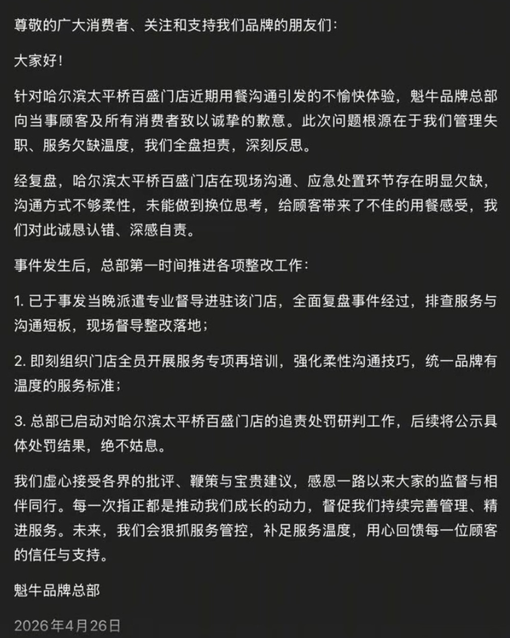 26日中午,魁牛潮汕牛肉自助火锅品牌方在短视频平台发布道歉信,称:“此次问题根源在于我们管理失职,服务欠缺温度,我们全盘担责,深刻反思。经复盘,哈尔滨太平桥百盛门店在现场沟通,应急处置环节存在明显欠缺,沟通方式不够柔性,未能做到换位思考,给顾客带来了不佳的用餐感受,我们对此诚恳认错,深感自责。”