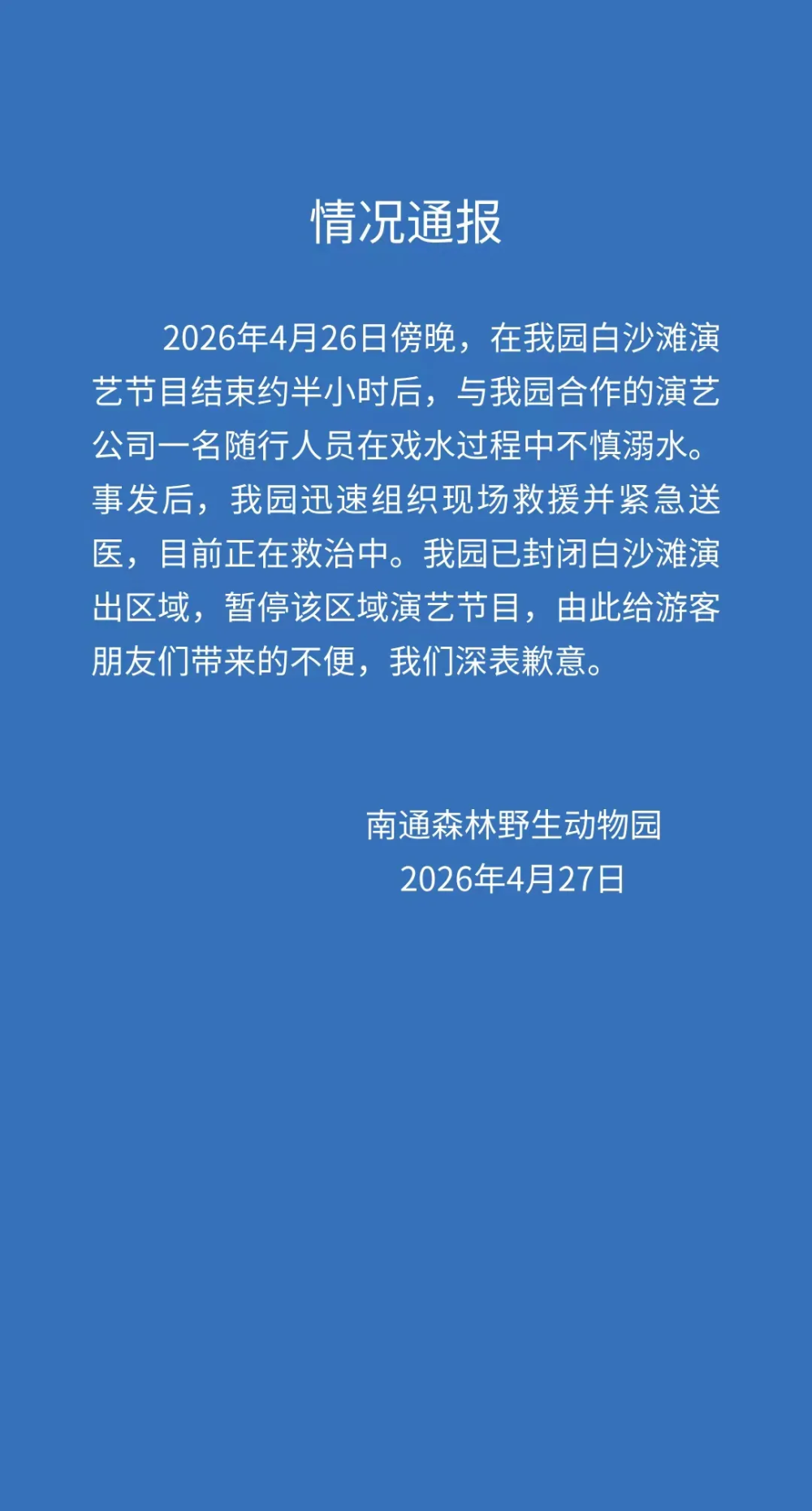 4月26日傍晚,在我园白沙滩演艺节目结束约半小时后,与我园合作的演艺公司一名随行人员在戏水过程中不慎溺水。事发后,我园迅速组织现场救援并紧急送医,目前正在救治中。我园已封闭白沙滩演出区域,暂停该区域演艺节目,由此给游客朋友们带来的不便,我们深表歉意。