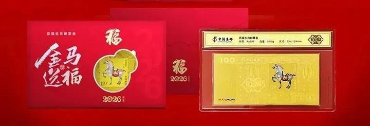 中国集邮精心打造的《2026金马送福·马年百福生肖邮票金》,把生肖、福运、黄金三种大家喜爱的元素,全揉进一张卡里!
