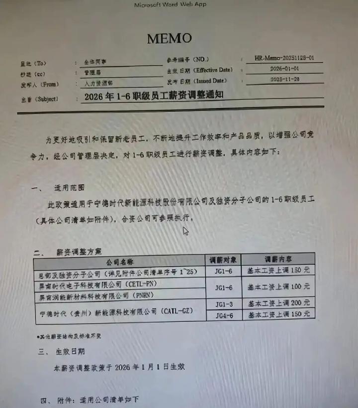 网络流传的宁德时代通知称,为更好地吸引和保留新老员工,不断地提升工作效率和产品品质,以增强公司竞争力,经公司管理层决定,2026年1月1日起对1—6职级员工进行薪资调整,基本工资上调150元,其他薪资结构及标准不变。据了解,此次宁德时代涨薪涉及的员工职级为基层员工。