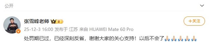 对此,张雪峰通过其微博表示:处罚期已过,已经深刻反省,谢谢大家的关心支持!以后不会了。