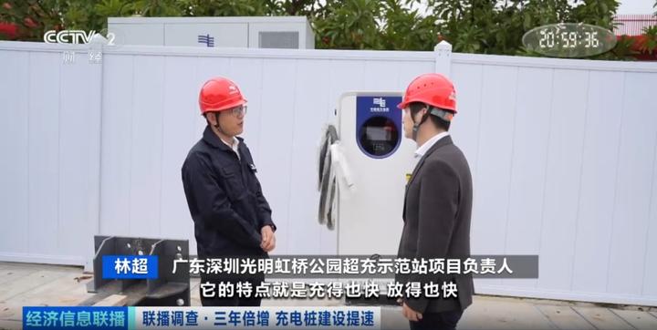 广东深圳光明虹桥公园超充示范站项目负责人 林超:它的特点是充得快、放得也快,单枪最大的充放电功率可以达到600千瓦,相当于10分钟可以充放100度电。