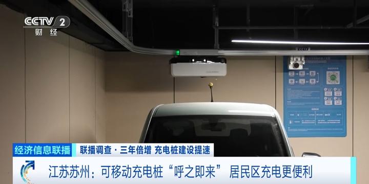 在江苏苏州一小区的地下停车场,一种新型可移动式的共享充电桩近日投入使用,一条导轨贯穿50个车位,机器人在导轨上穿行,抓取一台空闲充电桩,移动到刚刚停放的电动汽车后上方,车主取下充电枪即可为电动汽车充电。