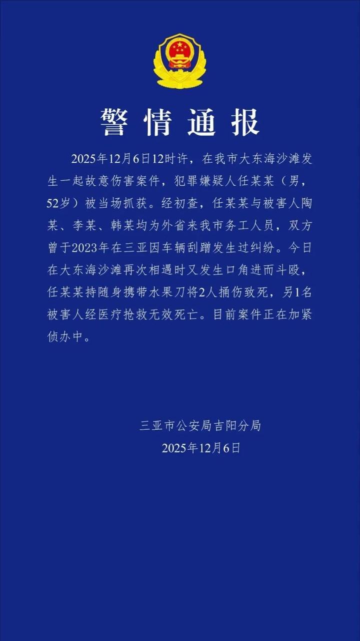 经初查,任某某与被害人陶某、李某、韩某均为外省来我市务工人员,双方曾于2023年在三亚因车辆刮蹭发生过纠纷。今日在大东海沙滩再次相遇时又发生口角进而斗殴,任某某持随身携带水果刀将2人捅伤致死,另1名被害人经医疗抢救无效死亡。