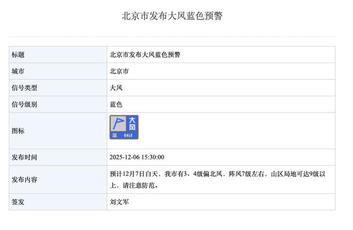12月6日15时30分,北京市发布大风蓝色预警:预计12月7日白天,本市有3、4级偏北风,阵风7级左右,山区局地可达9级以上,请注意防范。