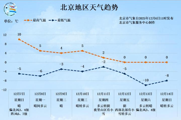 下周前期,北京以晴为主,气温较平稳;后期云量增多,有一次冷空气活动,12日前后部分地区有小雪天气,雪后北风加大,气温明显下降,请及时关注临近预报,提前做好防范措施。