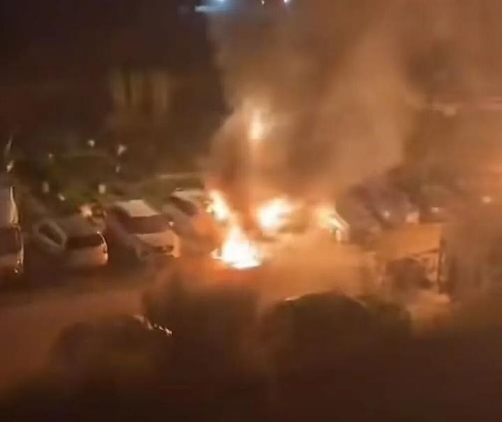 19时14分,明火已扑灭。现场是室外停车场车辆起火,燃烧面积约90平方米,无人员伤亡。
