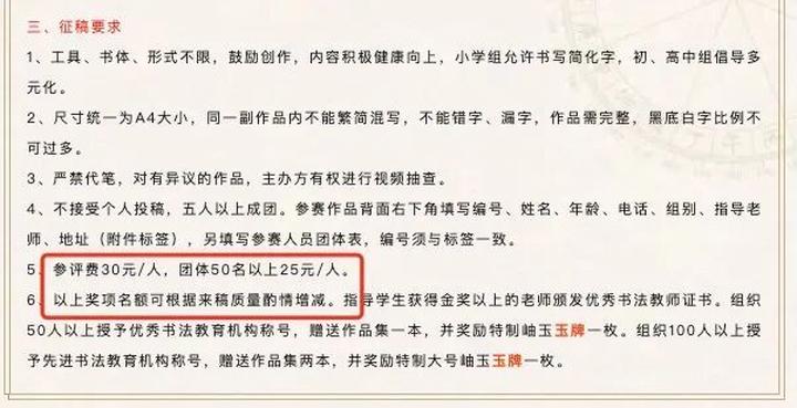澎湃新闻查询到,该赛事曾于2022年6月发布征稿启事,其中提及参评费为30元/人,团体50人以上为25元/人,并说明奖项名额可根据来稿质量适当增减。