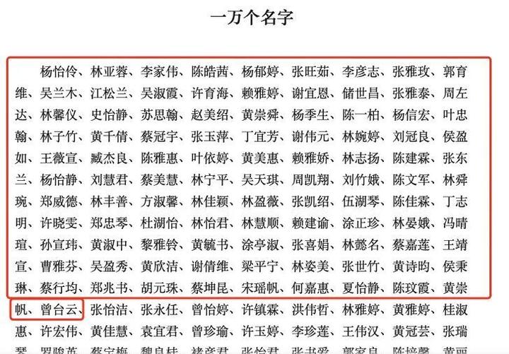 在公示的获奖名单中,特等奖80名获奖者中,大量姓名与网传文档《一万个名字》高度重合。例如:广西12名获奖者中,除前四人外,后续“谢思翰、李嘉宜、蔡绍吉、蔡家维、潘紫友、林丽怡、韩桂谕、杨美慧”8人姓名及排列顺序与文档完全一致;陕西9名获奖者中,“林志新、钟怡秀、林美信、广秀娟、陈贞劭、林佳安、蓝金凤、陈柔宏、赖宗翰”所有人名均与文档重合,其中7人顺序也一致。