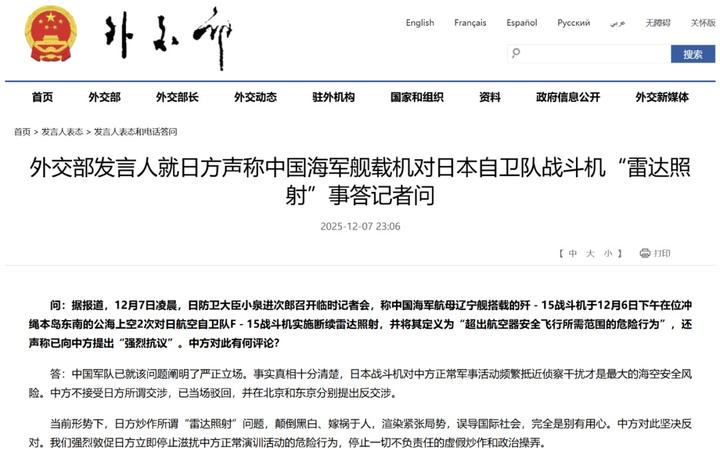 问:据报道,12月7日凌晨,日防卫大臣小泉进次郎召开临时记者会,称中国海军航母辽宁舰搭载的歼-15战斗机于12月6日下午在位冲绳本岛东南的公海上空2次对日航空自卫队F-15战斗机实施断续雷达照射,并将其定义为“超出航空器安全飞行所需范围的危险行为”,还声称已向中方提出“强烈抗议”。中方对此有何评论?