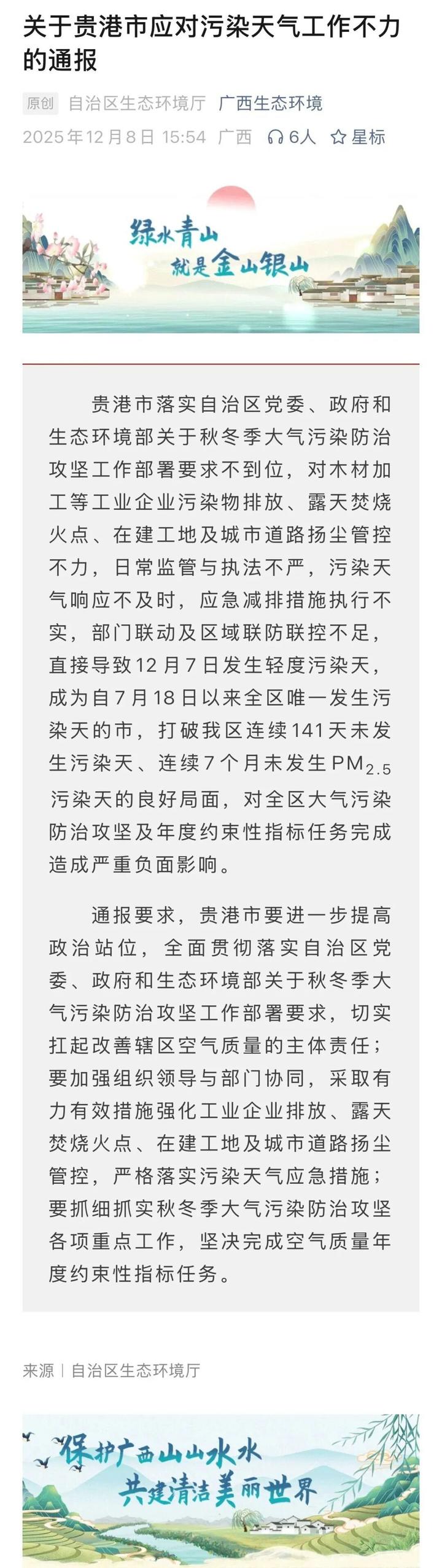 广西生态环境厅12月8日发布《关于贵港市应对污染天气工作不力的通报》,全文如下: