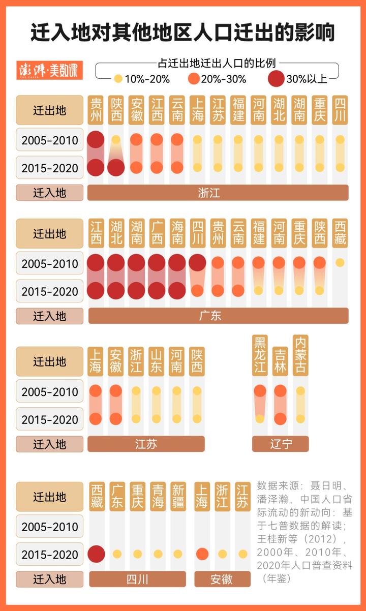 根据复旦大学人口研究所副教授潘泽瀚与上海金融与法律研究院研究员聂日明的研究,迁入省浙江、广东具有全国影响力。