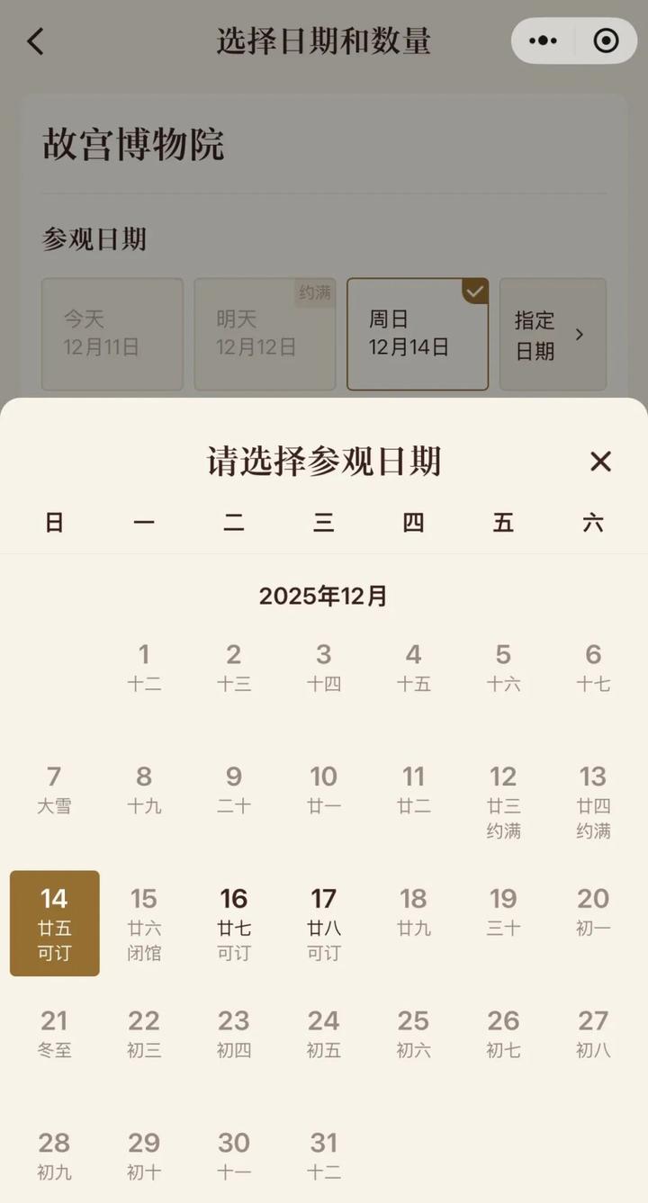 每逢下雪,故宫博物院门票便十分紧俏。记者查询故宫预约系统,周六(12月13日)故宫的门票已约满,周日(12月14日)尚有余票。
