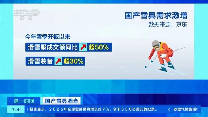 数据显示,今年雪季开板以来,滑雪服成交额同比增长超50%,滑雪装备增长超30%。其中,部分国产品牌滑雪服成交额同比增长超过60%,部分国产头盔、护具品牌成交额同比增长100%。