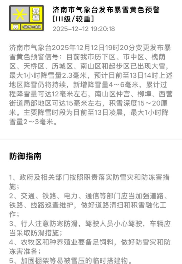 目前济南市历下区、市中区、槐荫区、天桥区、历城区、南山区和起步区已出现大雪,最大1小时降雪量2.3毫米,预计目前至13日14时上述地区降雪仍将持续,新增降雪量4~6毫米,累计过程降雪量可达12毫米左右,南山区仲宫、柳埠、西营街道局部地区可达15毫米左右,积雪深度15~20厘米。主要降雪时段为目前至13日凌晨,最大1小时降雪量2~3毫米。