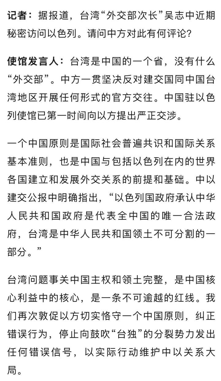 “以馆为家”微信公号12月13日消息,中国驻以色列使馆发言人就台湾当局外事部门官员窜以答记者问。