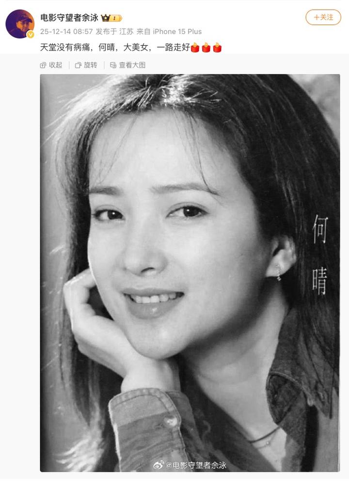 “电影守望者余泳”向记者证实了这一消息,他于社交平台发布何晴的黑白肖像照,并配文“天堂没有病痛,何晴,大美女,一路走好”,引发网友与演艺圈人士的集体缅怀。余泳透露,何晴生病后一直希望低调,让大家永远记住她美好的形象。