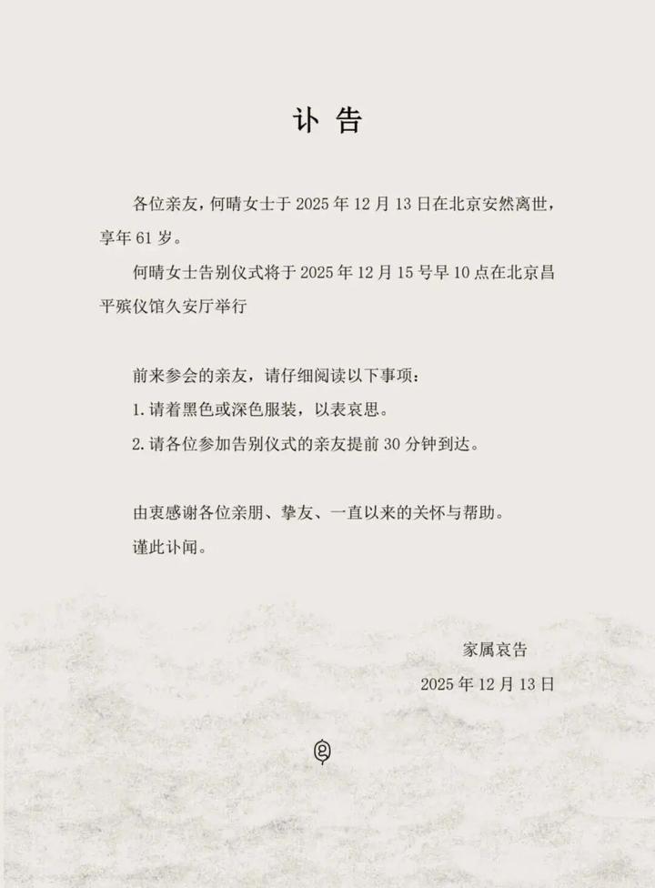 12月13日,一份家属发布的讣告显示,著名演员何晴在北京安然离世,享年61岁。告别仪式将于2025年12月15日早10点在北京昌平殡仪馆久安厅举行。