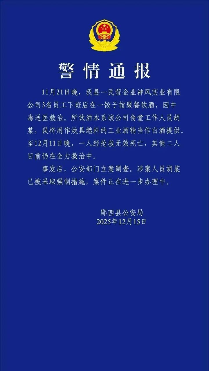 11月21日晚,郧西县一民营企业神风实业有限公司3名员工下班后在一饺子馆聚餐饮酒,因中毒送医救治。所饮酒水系该公司食堂工作人员胡某,误将用作炊具燃料的工业酒精当作白酒提供。至12月11日晚,一人经抢救无效死亡,其他二人目前仍在全力救治中。