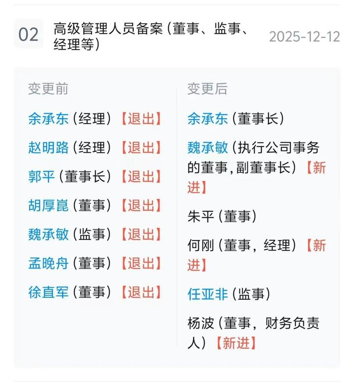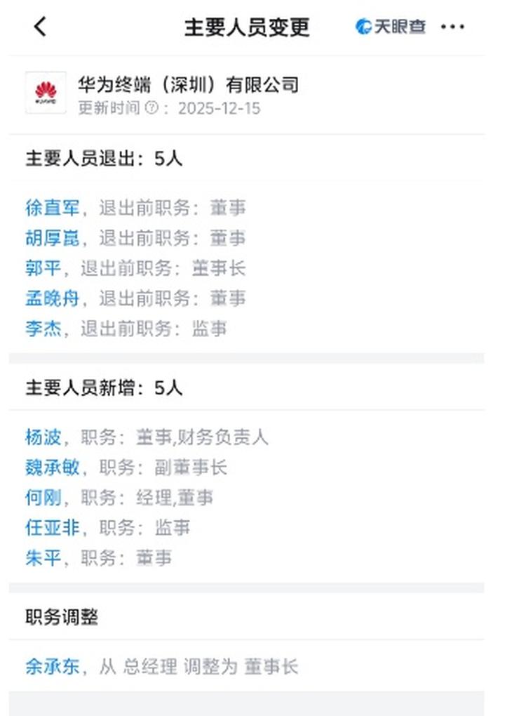 据天眼查,近日,华为终端(深圳)有限公司、华为终端有限公司双双发生工商变更,董事长均变更为余承东,法定代表人都变更为魏承敏。同时还有多位高管发生变更。