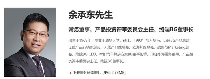 华为官网披露的管理层信息显示,当前余承东的职务是华为常务董事、产品投资评审委员会主任、终端BG董事长。